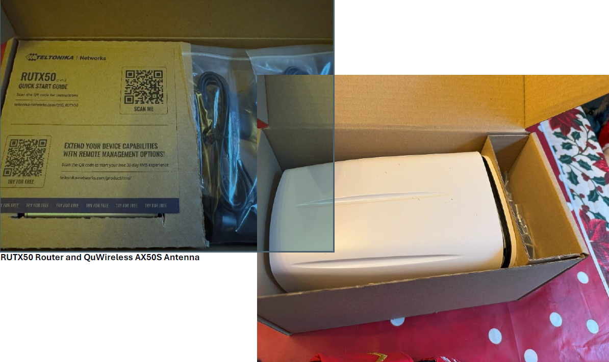 Specifically, the products ordered were a Teltonika RUTX50 router providing 3G/LTE/5G WAN plus 2.4g and 5.0gwireless LAN with a compatible antenna, which is in fact a QuWireless QuSpot AX50S rebadged, into which therouter is installed completely to make a single unit for installation.