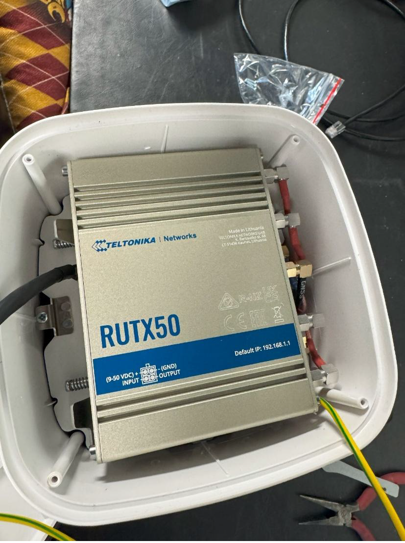 Unboxing the antenna and accessing the instructions online, the router was installed inside of the housing, connecting all of the antenna cables, the earth strap and the ethernet cable into LAN1 to receive power alongside data via the PoE Injector.